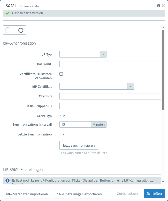 In früheren Versionen musste ein Zertifikat im PEM-Format in ein Textfeld kopiert oder importiert werden. Dieses Vorgehen wurde geändert. Nun muss zunächst das gewünschte Zertifikat in der Zertifikatsverwaltung importiert werden. Das importierte Zertifikat kann anschließend über IdP-Zertifikat ausgewählt werden. Alternativ kann die neue Option Zertifikats-Truststore verwenden aktiviert werden. In diesem Fall erfolgt die Überprüfung des Server-Zertifikats über den System-Zertifikats-Truststore; ein separates Zertifikat muss dann nicht angegeben werden.