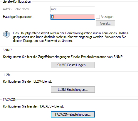 Die Einstellungen, um das Hauptgerätepasswort des Gerätes und die Einstellungen für SNMP zu ändern, finden Sie unter .
