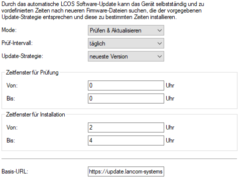 - Stellen Sie hier das Zeitfenster für die Update-Installation ein. Die tägliche Start- und Endzeit für dieses Zeitfenster kann stundengenau eingestellt werden. Die Standardeinstellung definiert ein Zeitfenster zwischen 2:00 Uhr und 4:00 Uhr. Wenn ein Update gefunden wurde, dann wird dieses also in diesem Zeitraum installiert und das Gerät neu gestartet, um das Update zu aktivieren. Innerhalb des konfigurierten Zeitfensters wird vom Auto Updater ein zufälliger Zeitpunkt für die Installation geplant.