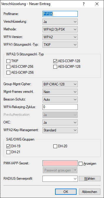 - Konfigurieren Sie hier das RADIUS-Serverprofil, welches bei der Verwendung von 802.1X zum Einsatz kommt. Bei der Verwendung von PSK-basierten Verschlüsselungsmethoden ist hier keine Eingabe erforderlich. Die Profile erzeugen Sie unter RADIUS.