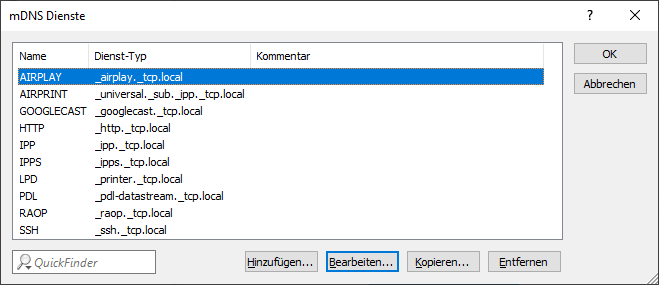 mDNS-Dienste enthält standardmäßig die gängigsten mDNS-basierten Dienste, kann aber auch manuell erweitert werden.