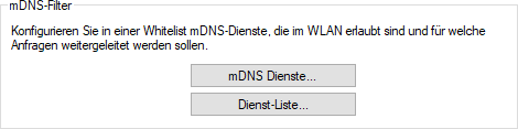 Da mDNS-Anfragen als Multicast versendet werden, muss das Versenden auf WLAN-Ebene mit der kleinsten erlaubten Datenrate erfolgen, wodurch je nach Aufkommen an mDNS-Anfragen sehr viel Airtime belegt wird. Mittels des mDNS-Filter lassen sich Anfragen an definierbare mDNS-Dienste selektiv erlauben, die über das WLAN weitergeleitet werden sollen.