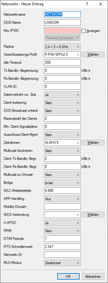 Anmerkung: Dieser Eintrag kommt nur dann zum Tragen, wenn ein Verschlüsselungsprofil ausgewählt wird, welches WPA(2)-PSK oder WEP verwendet (WEP ist unsicher und wird lediglich aus Gründen der Abwärtskompatibilität unterstützt. LANCOM Systems GmbH empfiehlt jedoch ausdrücklich, WPA2 oder WPA3 zu verwenden). Wird 802.1X verwendet, hat der Eintrag keine Auswirkung, das Feld kann dann leer gelassen werden.