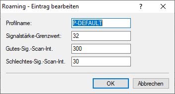 - Fällt die Signalstärke auf den angegebenen Grenzwert, wird direkt ein Scan ausgelöst, um nach einem besseren Access Point zu suchen. Ist kein besserer Access Point vorhanden, wird in der angegebenen Zeit in Sekunden weiter gesucht, bis eine Verbindung zu einem Access Point mit einer besseren Signalstärke verbunden werden konnte oder sich das Signal mit dem verbundenen Access Point wieder verbessert hat.