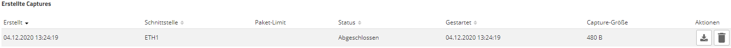 In der Liste "erstellte Captures" können Sie angelegte Captures starten, stoppen und als pcap-Datei herunterladen.