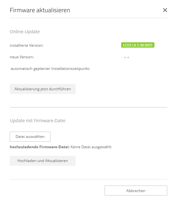 Wählen Sie über Datei auswählen eine Firmware-Datei aus, die Sie auf das Gerät hochladen wollen. Dies kann ggf. auch eine vorherige Version sein, auf die Sie zurückgehen wollen. Über die Schaltfläche Hochladen und Aktualisieren laden Sie die ausgewählte Firmware-Datei auf das Gerät hoch und aktualisieren somit auf diese Firmware.