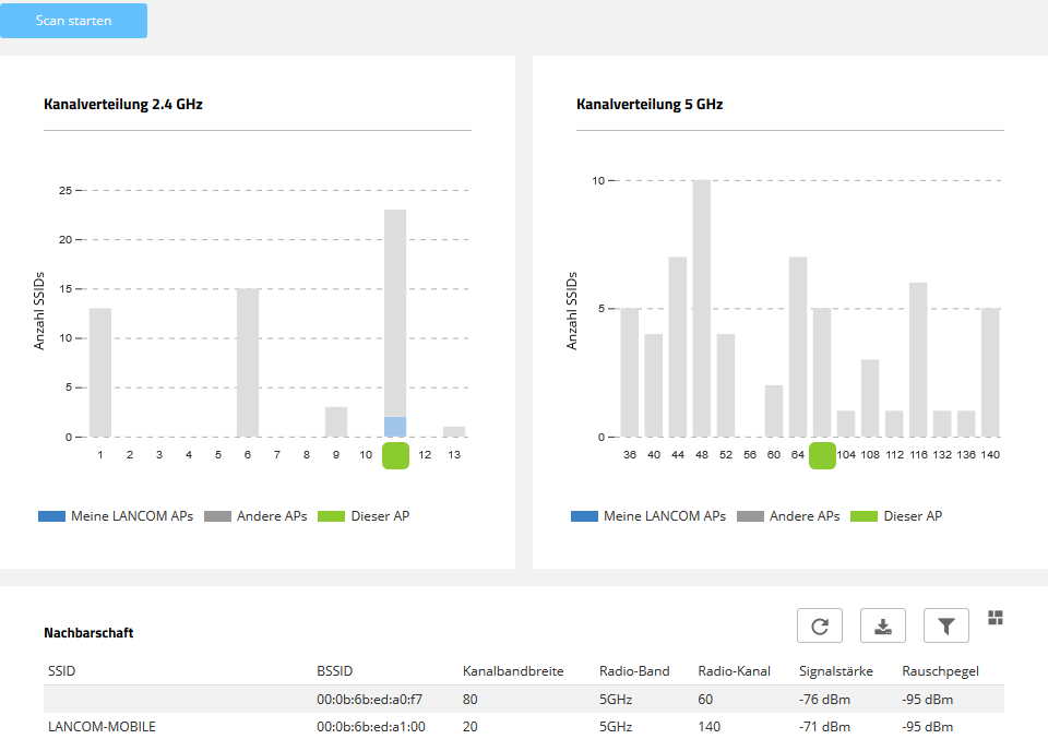Die oberen beiden Balkendiagramme visualisieren, wie viele SSIDs vom Gerät auf den verschiedenen 2,4‑GHz- und 5‑GHz-Kanälen erkannt wurden und potentiell eine Belastung des Mediums auf diesem Kanal darstellen. LANCOM Access Points, die vom Scan erkannt wurden und gleicheitig im gleichen LAN-Netzwerk erreichbar sind, wie das aktuelle Gerät, werden in den Diagrammen als "Meine LANCOM APs" besonders hervorgehoben. Zusätzlich wird visualisiert, auf welchem WLAN-Kanal das aktuelle Gerät selber arbeitet. Die Tabelle Nachbarschaft liefert zusätzlich detaillierte Ausgaben zu den vom Scan erkannten SSIDs, z. B. den Namen, die BSSID (MAC-Adresse) und die Signalstärke.