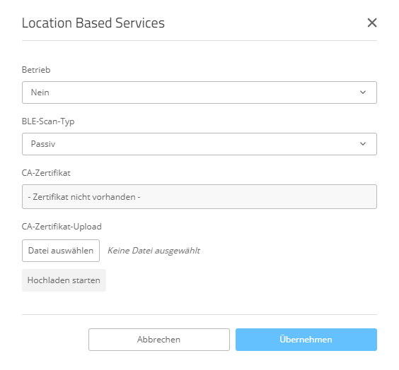 - Bei der Verwendung von HTTPS muss zusätzlich ein CA-Zertifikat zur Überprüfung des Servers auf das Gerät hochgeladen werden. Dieses können Sie hier erledigen, indem Sie die Zertifikatsdatei auswählen und anschließend hochladen.