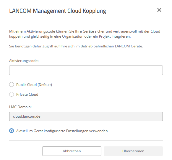 - Geben Sie den Aktivierungscode ein, den Sie vorab in Ihrem LANCOM Management Cloud-Projekt generiert haben.