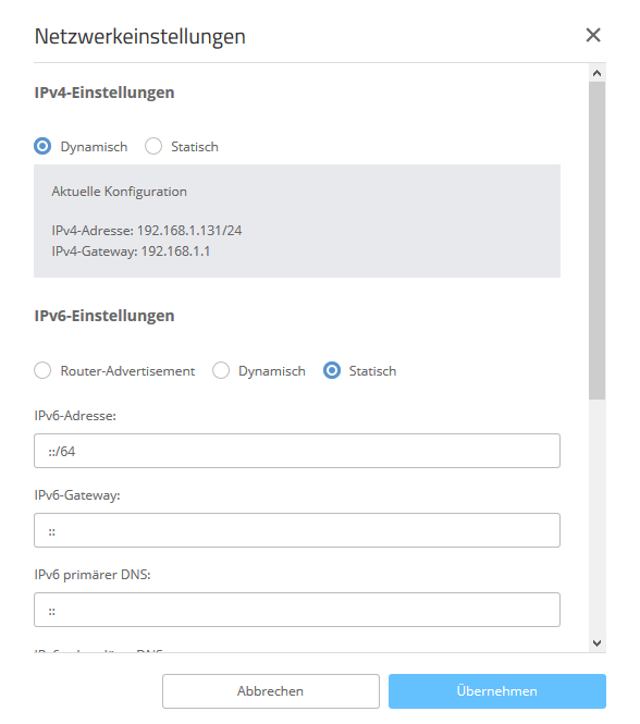 Wichtig: Beachten Sie, dass die IPv4-Adresse in CIDR-Notation angegeben werden muss (z. B. 192.168.1.1/24).