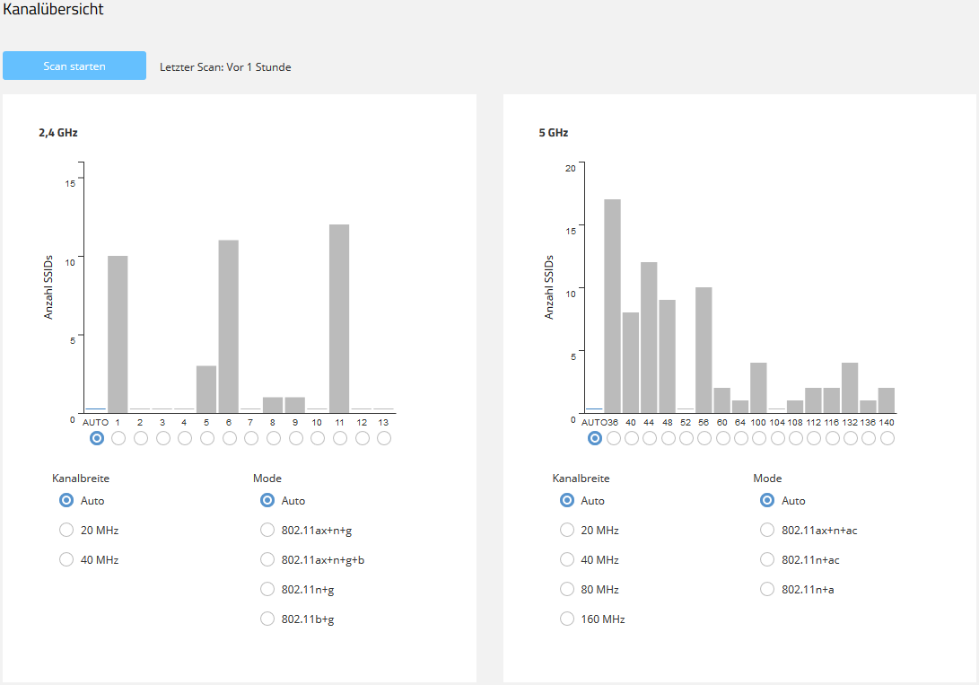 Die beiden Balkendiagramme visualisieren, wie viele SSIDs vom Gerät auf den verschiedenen 2,4‑ und 5‑GHz-Kanälen erkannt wurden und potentiell eine Belastung des Mediums auf diesem Kanal darstellen.