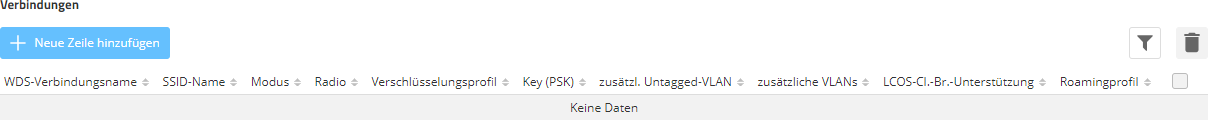 Konfigurieren Sie hier alle generellen Einstellungen rund um die WDS-Verbindung. Fügen Sie je WDS-Verbindung eine Zeile zur Tabelle hinzu. Standardmäßig ist die Tabelle leer.