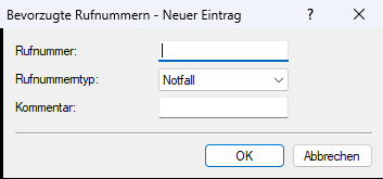 Tragen Sie in dieser Tabelle Notfallrufnummern ein. Kann ein Ruf zu einer Notfallrufnummer aufgrund einer Fehlermeldung vom SIP-Provider nicht aufgebaut werden, wird ein bereits aufgebauter Ruf, der über diese Leitung (Leitungstyp Trunk/Flex) bzw. dem Leitungsverbund (Leitungstyp Einzel-Account/Provider) geführt wird, abgebaut. So wird sichergestellt, dass ein Sprachkanal für diese Notruf zur Verfügung steht.