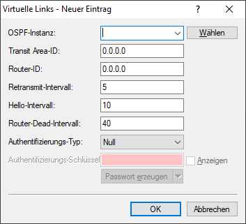 In dieser Tabelle können Virtuellen Links (auch bezeichnet als Transit-Area) definiert werden. Grundsätzlich müssen bei OSPF alle Areas direkt mit der Backbone-Area verbunden sein. In Fällen, wo dies nicht möglich ist, können virtuelle Links verwendet werden. Ein virtueller Link verbindet einen Router durch eine nicht-Backbone-Area mit der Backbone-Area.