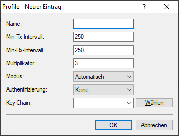 - Name der Key-Chain aus der Tabelle Key-Chain. Definiert den verwendeten Schlüssel für die BFD-Nachrichten. Beim Parameter Authentifizierung muss ein anderer Wert außer "Keiner" konfiguriert sein.