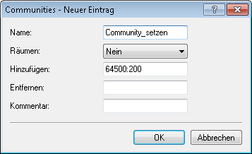 "Community" ist ein optionales BGP-Attribut, mit dessen Hilfe Sie Präfixe in logischen Gruppen zusammenfassen und darüber identifizieren können. Auf diese Gruppen lassen sich Ein- und Ausgangsregeln anwenden. Zu einem Präfix können Sie mehrere Communities definieren.