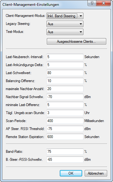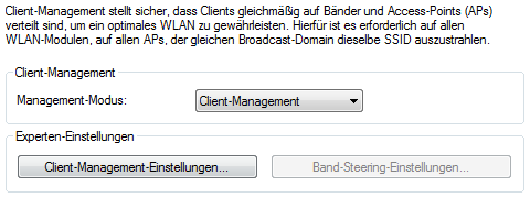 - Bei Access Point mit mehreren WLAN-Modulen kann das Client Management mit und ohne Band Steering durchgeführt werden. Standardeinstellung: inkl. Band Steering