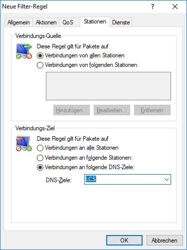 In können Sie eine neue Filter-Regel anlegen und dort auf dem Reiter Stationen unter Verbindungen an folgende DNS-Ziele aus den konfigurierten DNS-Zielen auswählen.