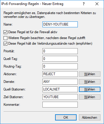 In können Sie eine neue Regel anlegen. Als Ziel-Stationen können Einträge aus den Tabellen DNS-Ziele bzw. DNS-Ziel-Liste verwendet werden.