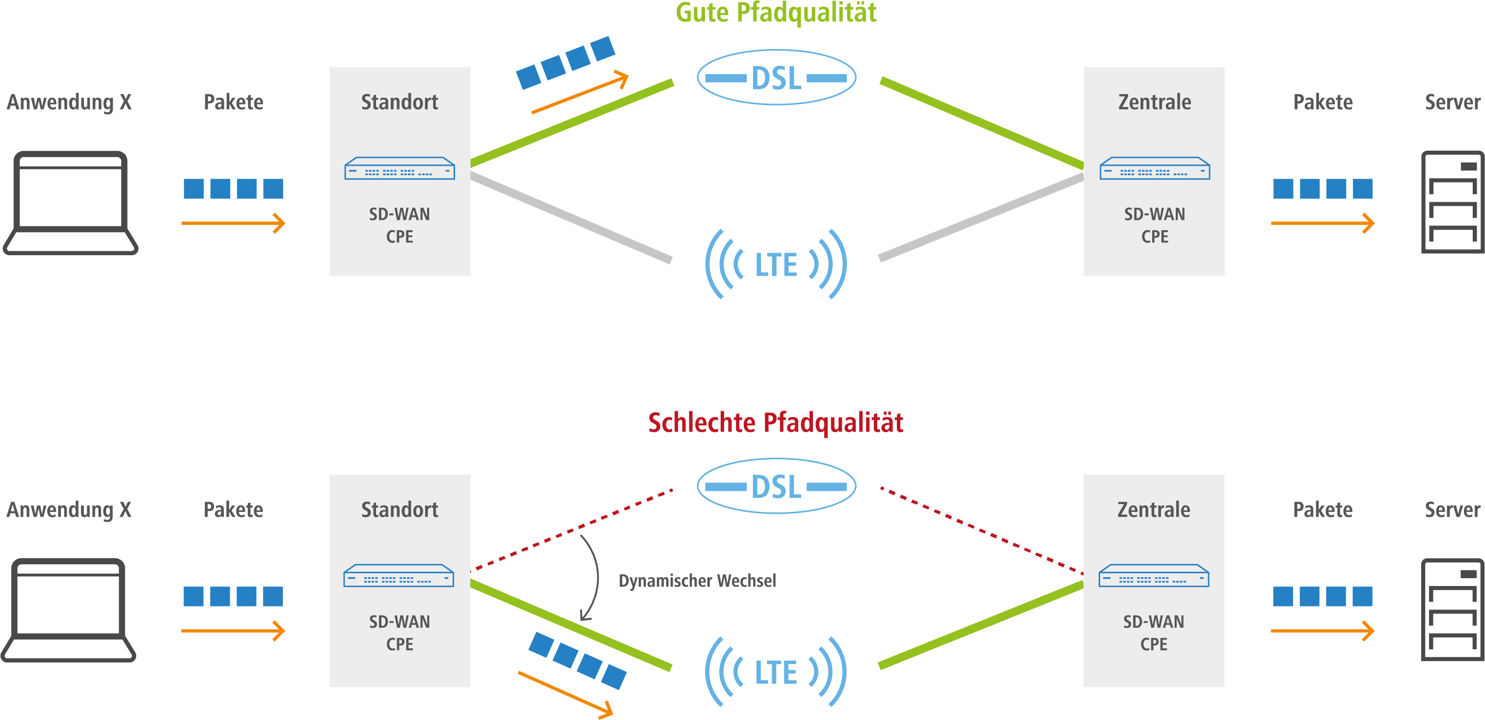 In SD‑WAN-Szenarien sollen MPLS-Leitungen entweder ersetzt oder um kostengünstige Internetverbindungen wie DSL, Kabelinternet, Glasfaser oder 4G/5G ergänzt werden. Mithilfe von Load Balancing kann die Gesamtbandbreite aller zur Verfügung stehenden Leitungen ausgenutzt werden. Um die Performance geschäftskritischer Anwendungen sicherzustellen, kann Dynamic Path Selection eingesetzt werden. Dabei werden alle Leitungen kontinuierlich durch aktives Monitoring mithilfe von ICMP-Paketen überwacht und daraus Metriken für Last, Paketverlust, Latenz und Jitter berechnet. Durch Richtlinien werden Anforderungen der Business-Anwendungen wie z. B. Echtzeitdatenverkehr an Leitungen definiert, beispielweise der erlaubte Paketverlust oder die maximale Latenz eines möglichen Pfades. Der Algorithmus zur Dynamic Path Selection wählt für Sessions die Leitung mit der besten Qualität aus. Erfüllen mehrere Leitungen die geforderten Richtlinien, so wird ein Load Balancing im Round-Robin-Verfahren über diese Leitungen durchgeführt.