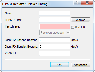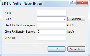 - Wählen Sie hier das Profil aus, für das der LEPS-U-Benutzer gültig sein soll. Es können sich nur LEPS-U-Benutzer an der SSID anmelden, mit der sie über das LEPS-U-Profil verbunden sind.