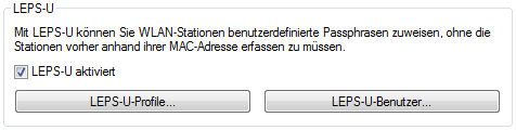 Die Konfiguration der LEPS-U-Profile und LEPS-U-Benutzer finden Sie in LANconfig unter . Über den Schalter LEPS-U aktiviert wird LEPS-U eingeschaltet.