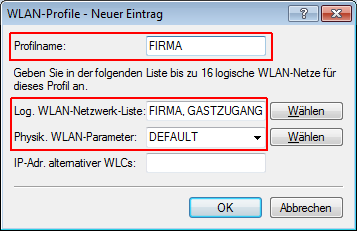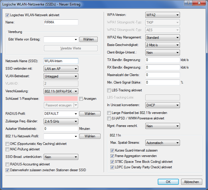 In diesem Beispiel haben die Mitarbeiter einer Firma Zugang zu einem eigenen WLAN (SSID), die Gäste erhalten über einen Public Spot ebenfalls Zugang zum Internet. Die APs in allen Bereichen des Gebäudes bieten die beiden SSIDs 'FIRMA' und 'GAESTE' an.