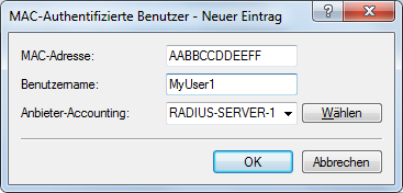 Bei der Konfiguration mit LANconfig finden Sie die Parameter für die Authentifizierung der Clients über die MAC-Adresse im Dialog .