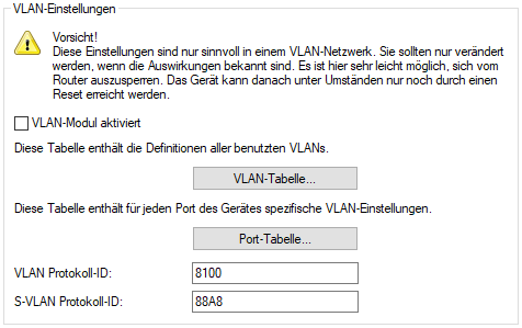 - Konfigurieren Sie hier das S-VLAN bei doppeltem VLAN-Tagging (Q-in-Q-VLAN-Verbindungen nach IEEE 802.1ad). Das VLAN wird auch als äußeres VLAN bezeichnet. Die verwendete S-VLAN-Protokoll-ID kann unter konfiguriert werden.