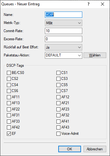 Der Serviceklasse VoIP wird eine absolute Bandbreite von 10 Mbit/s zugewiesen. Der Kunde markiert seine Pakete per DSCP, so dass die Pakete der korrekten Queue im Router zugewiesen werden können.