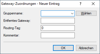 Unter Gateway-Zuordnungen können Sie Gateway-Gruppen einrichten, die Sie dann unter Weitere entfernte Gateways referenzieren können. Entferntes Gateway und Gruppenname bilden zusammen den Primärschlüssel der Tabelle, d. h. die Kombination aus beiden muss innerhalb der Tabelle eindeutig sein. Damit kann ein einzelner Gateway aber auch mehreren Gruppen zugeordnet werden, insofern das gewünscht ist.