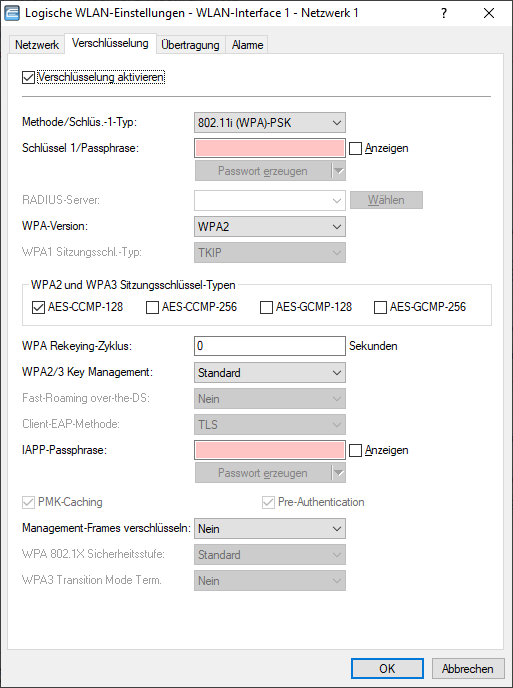 Wichtig: Client-seitig ist die Anzahl gleichzeitiger Prä-Authentifizierungen auf vier begrenzt, um in Netzwerk-Umgebungen mit vielen APs die Netzlast für den zentralen RADIUS-Server gering zu halten. - Management-Frames verschlüsseln
