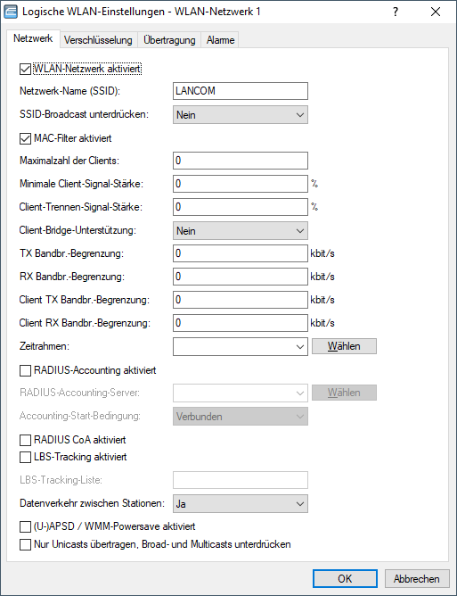- Hier begrenzen Sie die Bandbreite (Limit in kBit/s) in Senderichtung, die jedem WLAN-Client auf dieser SSID zur Verfügung steht. Der Wert 0 deaktiviert die Begrenzung.