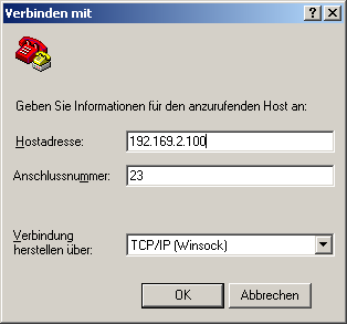 Wählen Sie im Fenster 'Verbinden mit' im Pulldown-Menü 'Verbindung herstellen über' den Eintrag 'TCP/IP'. Geben Sie anschließend als 'Hostadresse' die lokale/öffentliche IP-Adresse oder den FQDN des Gerätes ein. Nach der Bestätigung erscheint im HyperTerminal eine Login Aufforderung. Geben Sie nun das Konfigurationspasswort ein.