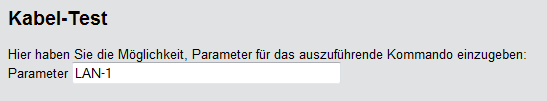 Mit dem Kabel-Test können Sie aus dem Gerät heraus die Verkabelung testen. Wechseln Sie dazu unter WEBconfig in den Menüpunkt . Geben Sie dort die Bezeichnung des Interfaces ein, das Sie testen wollen (z. B. “DSL1” oder “LAN-1”). Achten Sie dabei auf die genaue Schreibweise der Interfaces. Mit einem Klick auf die Schaltfläche Ausführen starten Sie den Test für das eingetragene Interface.