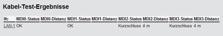 Wechseln Sie anschließend in den Menüpunkt . In der Liste sehen Sie die Ergebnisse, die der Kabel-Test für die einzelnen Interfaces ergeben hat.