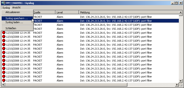 - In LANmonitor haben Sie zusätzlich die Möglichkeit, das Syslog aus dem Gerät zu exportieren und in einer Datei zu speichern. Klicken Sie dazu mit der rechten Maustaste auf den Namen des Gerätes und wählen Sie im Kontextmenü den Eintrag Syslog anzeigen. Die Ansicht ist jeweils ein aktueller Schnappschuss. Mit Aktualisieren wird eine Kopie des derzeitigen SYSLOGs vom Gerät exportiert und in der Ansicht dargestellt. Syslog speichern speichert die aktuelle Anzeige in eine Datei. Gespeicherte SYSLOGs können mit Syslog laden wieder zur Ansicht geöffnet werden.
