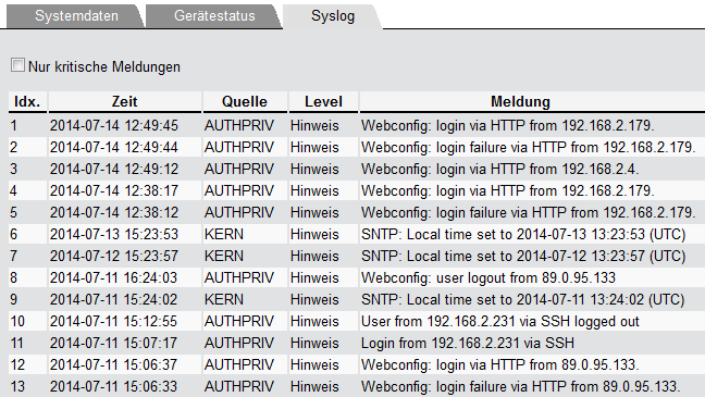 Alternativ können Sie die aktuellen SYSLOG-Meldungen auf der Startseite von WEBconfig auf der Registerkarte Syslog einsehen: