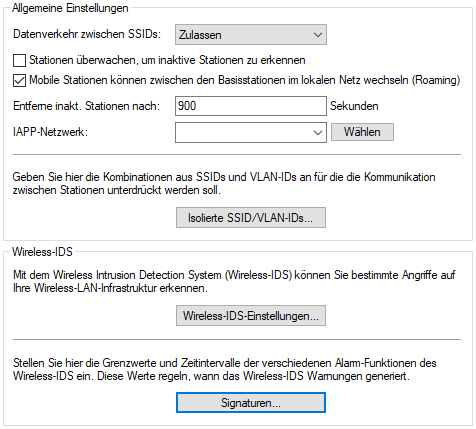 - Neben der Kommunikation der Clients untereinander kann hier auch eingestellt werden, ob die benachbarten APs beim Roaming Informationen über das Inter Access Point Protocol (IAPP) austauschen. Das IAPP ist ein Protokoll zur Kommunikation zwischen APs. Der "abgebende AP" bekommt so die Nachricht, dass ein bei ihm eingebuchter WLAN-Client nun zu einem anderen AP wechselt und kann den Client sofort aus seiner Liste entfernen.