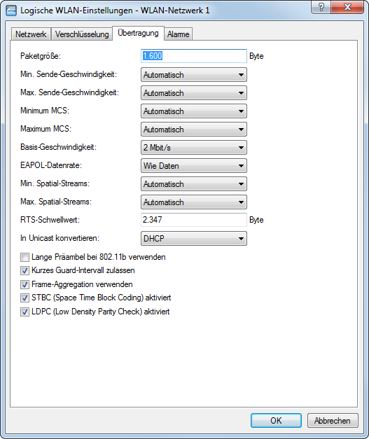 Dazu schickt 1 vor der eigentlichen Übertragung ein RTS-Paket an 2, das 2 mit einem CTS beantwortet. Das von 2 ausgestrahlte CTS ist jetzt aber in "Hörweite" von 3, so dass 3 mit seinem Paket an 2 warten kann. Die RTS- und CTS-Signale beinhalten jeweils eine Zeitangabe, wie lange die folgende Übertragung dauern wird. Eine Kollision bei den recht kurzen RTS-Paketen ist sehr unwahrscheinlich, die Verwendung von RTS/CTS erhöht aber dennoch den Overhead. Der Einsatz dieses Verfahrens lohnt sich daher nur für längere Datenpakete, bei denen Kollisionen wahrscheinlich sind. Mit dem RTS-Schwellenwert wird eingestellt, ab welcher Paketlänge das RTS/CTS eingesetzt werden soll. Der passende Wert ist in der jeweiligen Umgebung im Versuch zu ermitteln.Wichtig: Der RTS/CTS-Schwellenwert muss auch in den WLAN-Clients entsprechend den Möglichkeiten des Treibers bzw. des Betriebssystems eingestellt werden. - In Unicast konvertieren