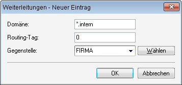 Um alle Domains mit der Endung ".intern" auf einen DNS-Server im LAN der Gegenstelle "FIRMA" umzuleiten, erstellen Sie folgenden Eintrag: