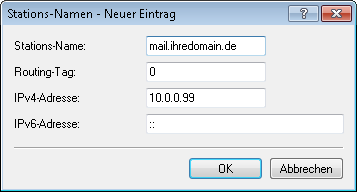 Wenn Sie z. B. in einem externen Büro oder in einer Filiale arbeiten und die Mitarbeiter über den Router den Mailserver in der Zentrale (Name: "mail.ihredomain.de", IP: "10.0.0.99") erreichen wollen, tragen Sie ein: