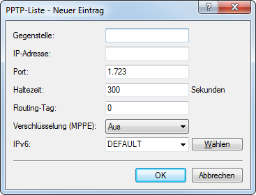- IP-Port, über den das PPTP-Protokoll läuft. Dem Protokollstandard gemäß sollte immer Port '1.723' angegeben sein.