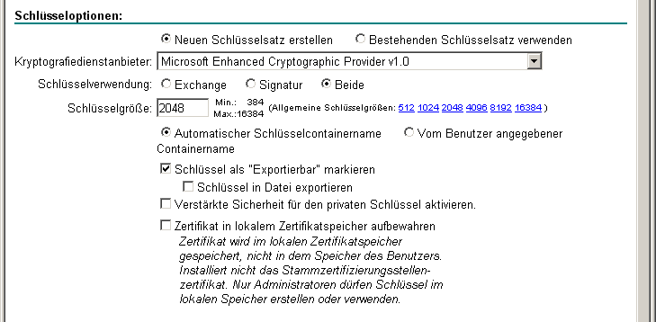 - Wählen Sie eine geeignete Schlüssellänge (passend zur Zertifikats-Policy), aktivieren Sie die Option für exportierbare