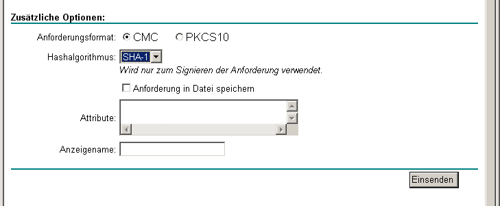 - Wählen Sie zuletzt als Hash-Algorithmus 'SHA-1' und reichen Sie die Zertifikatanforderung mit Einsenden ein.