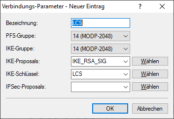 In den VPN-Verbindungs-Parametern müssen zum Schluss die VPN-Verbindungen auf die Verwendung der richtigen IKE-Proposals eingestellt werden ('IKE_RSA_SIG'). Dabei müssen die Werte für 'PFS-Gruppe' und 'IKE-Gruppe' mit den in den IKE-Verbindungs-Parametern eingestellten Werten übereinstimmen.