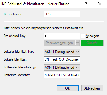 - Der Typ der Identitäten wird auf ASN.1 Distinguished Names umgestellt (lokal und remote).