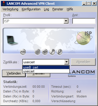 - Bei aktivierter Softzertifikatsauswahl können Sie beim Verbindungsaufbau im Hauptfenster des LANCOM Advanced VPN Client jeweils das gewünschte Zertifikat aus der Liste auswählen, passend zum gewählten Profil.