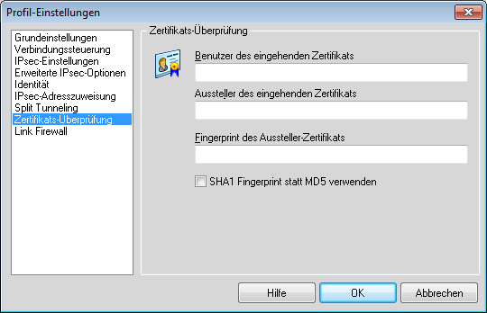 - Bei der Zertifikatsüberprüfung können Sie optional die Zertifikate einschränken, die der LANCOM Advanced VPN Client akzeptiert. Dazu geben Sie den Benutzer und / oder den Aussteller des eingehenden Zertifikats und ggf. den zugehörigen "Fingerprint" an.