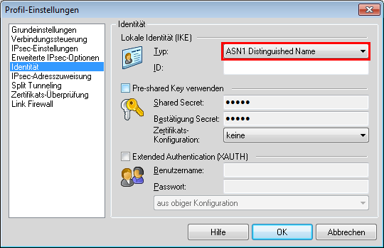 - Stellen Sie die Identität auf 'ASN1 Distinguished Names' um. Die 'Identität' kann frei bleiben, da diese Information aus dem Zertifikat ausgelesen wird.